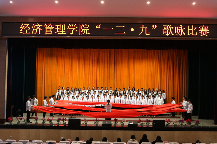 为纪念“一二·九”爱国运动89周年,激发学生的爱党爱国热情与使命担当,11月20日晚,经济管理学院在学校大礼堂举办了“一二·九”歌咏比赛。此次活动吸引了全院学生的广泛参与,现场气氛热烈,精彩纷呈。