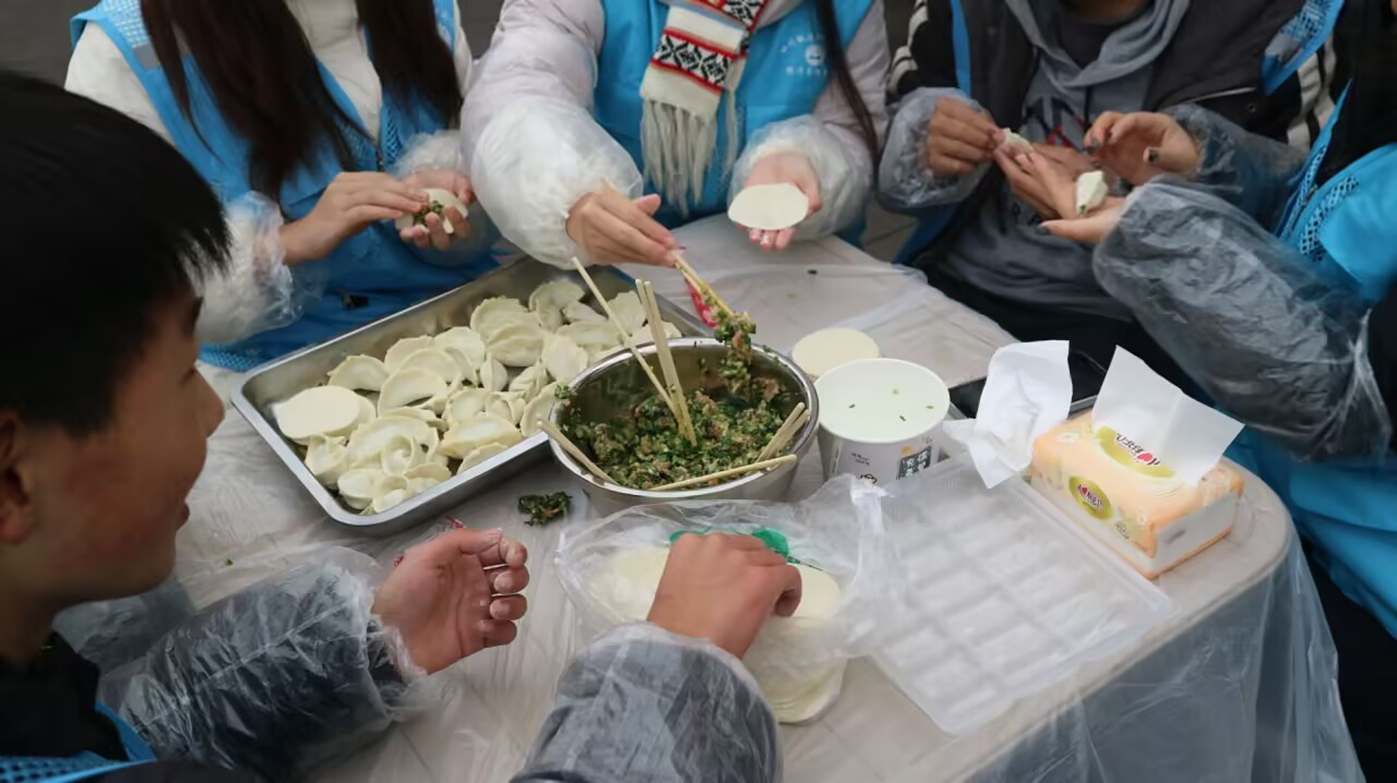 活动当日,志愿者们早早来到横山村。在简单的准备工作之后,大家开始着手与村民一起包饺子。他们有的熟练地揉面、擀皮,有的负责精心调配馅料,还有的专注于包饺子。老人们给同学们传授包饺子的小窍门,讲述冬至传统习俗。志愿者们则分享着校园生活趣事。不一会儿,案板上就摆满了虽形态各异却饱满诱人的饺子。欢声笑语此起彼伏,营造出一片欢乐吉祥的节日氛围。