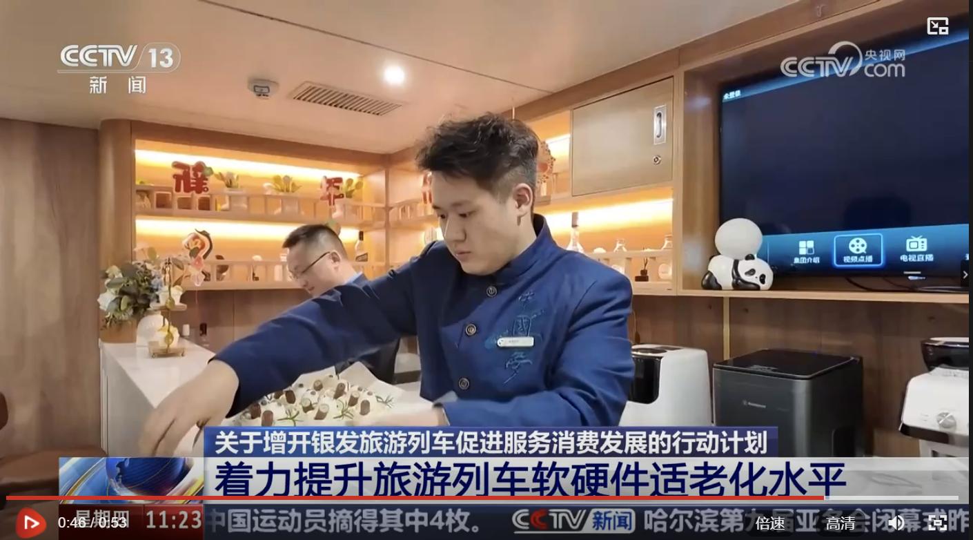近日,商务部、文化和旅游部、国铁集团等9单位联合印发了《关于增开银发旅游列车 促进服务消费发展的行动计划》。2月13日,中央新闻频道、中央广播电视总台微信公众号“主播说联播”视频号等新闻媒体中就该计划进行了宣传。来自学校经济管理学院的2024届毕业生高铂然在成都铁路局旅游列车—熊猫专列上的工作场景出现在新闻视频中。