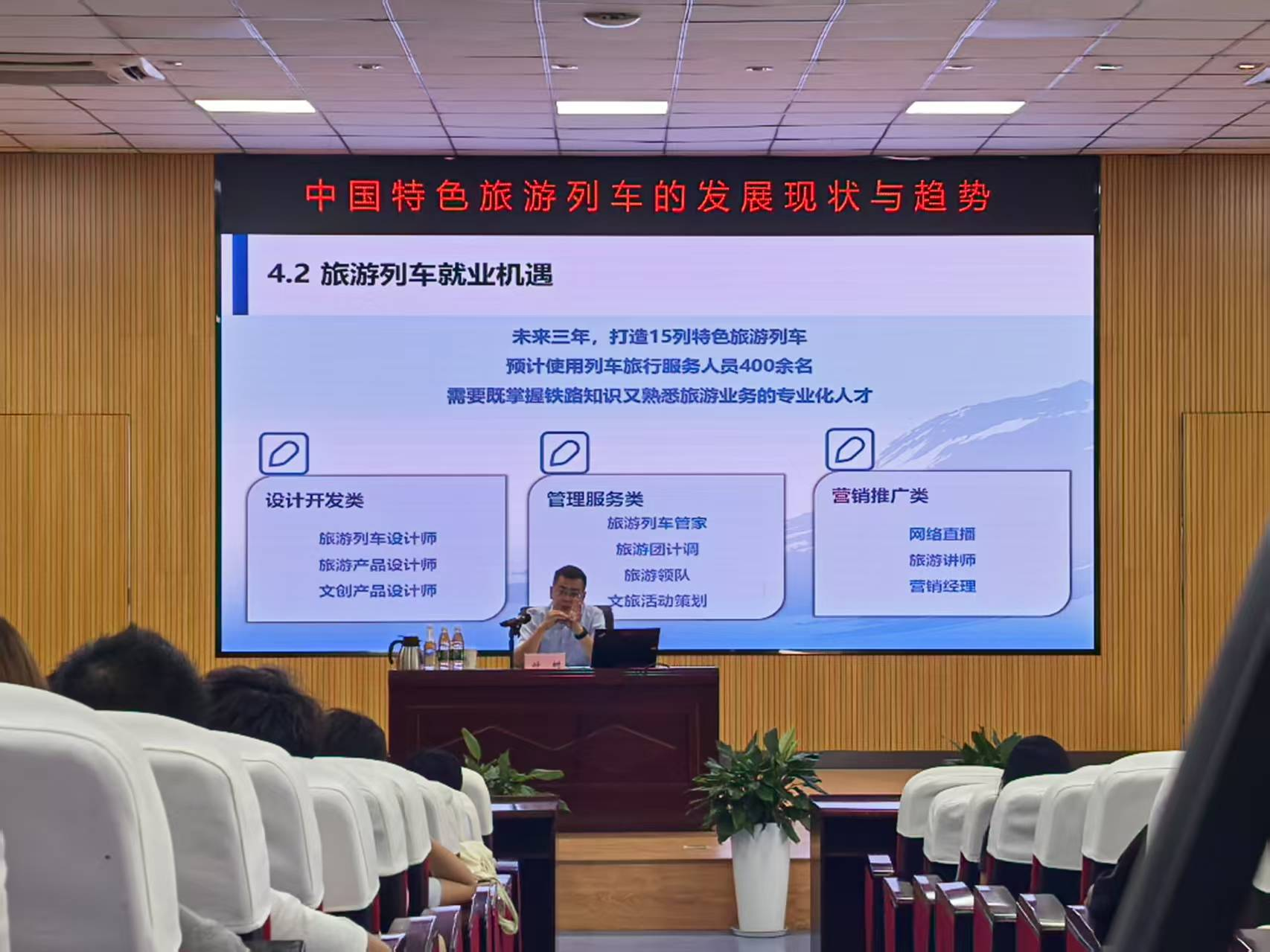 讲座中,钟树围绕 “旅游列车创新发展的时代机遇”“铁路特色旅游列车的发展现状”“特色旅游列车发展的未来展望”“铁路旅游岗位需求和就业机遇” 四大核心板块,结合丰富的行业经验与案例,为同学们展开了全面而深入的分享。他着重介绍了中国铁路成都局匠心打造的 “什邡号”“安逸号”“岷江号” 及 “成都号” 四辆特色旅游列车,从列车别具一格的设计理念、充满地域文化特色的服务内容,到其显著的经济效益与市场反响,都进行了细致入微的讲解。他还介绍了国铁集团未来三年在铁路旅游领域的战略规划,为同学们描绘了铁旅融合发展的宏伟蓝图。