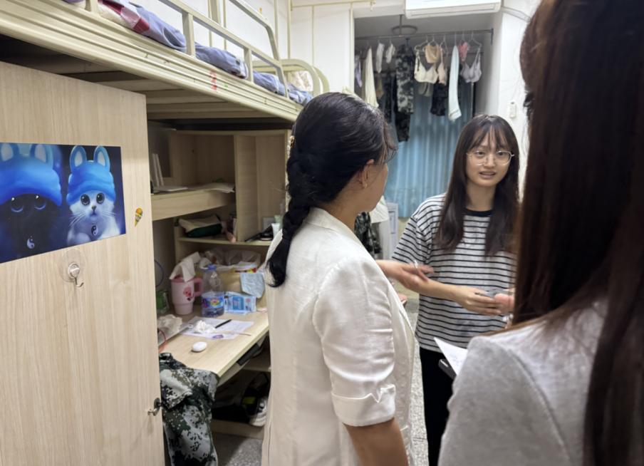 分发药品后,文容和辅导员到寝室进行走访新生同学,细致叮嘱同学们注意防寒保暖,及时吹干头发、更换干爽衣物,并冲服感冒灵冲剂以防感冒。一句句暖心嘱咐,一次次亲手递送,让刚刚离家步入大学校园的新同学们深刻感受到学院如家一般的温暖与关怀。