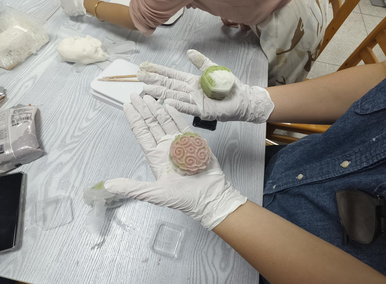 活动中,“经纬匠心社”韩湘同学为师生详细讲解了冰皮月饼的制作技巧,从面团揉制到馅料搭配,再到模具使用,逐步演示,确保零基础参与者快速上手。现场欢声笑语不断,师生围坐交流,有的专注调整月饼造型,有的分享创意馅料搭配,营造了欢乐祥和的活动氛围。“以前都是买月饼,这次和老师同学一起做,感觉特别亲切,就像一家人过节!”参与同学兴奋地表示。同学们亲手体验中秋习俗,感受中华优秀传统文化魅力,增强文化自信与民族认同感,有学生反馈 “活动有趣又有意义,希望能够举办更多类似的手工制作活动”。