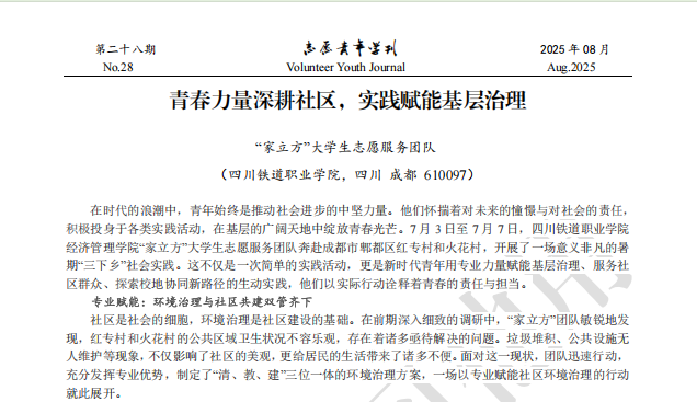 近日,经济管理学院“家立方”大学生志愿服务团队撰写的实践纪实作品《青春力量深耕社区,实践赋能基层治理》被《志愿青年学刊》(国际刊号ISSN 2709-5266)正式录用刊发。同时,在该刊物主办的2025年暑期“三下乡”社会实践刊推优评选中,该作品荣获“活动纪实类三等奖”。团队指导教师李丹、陶俊洁荣获“优秀指导教师”称号。