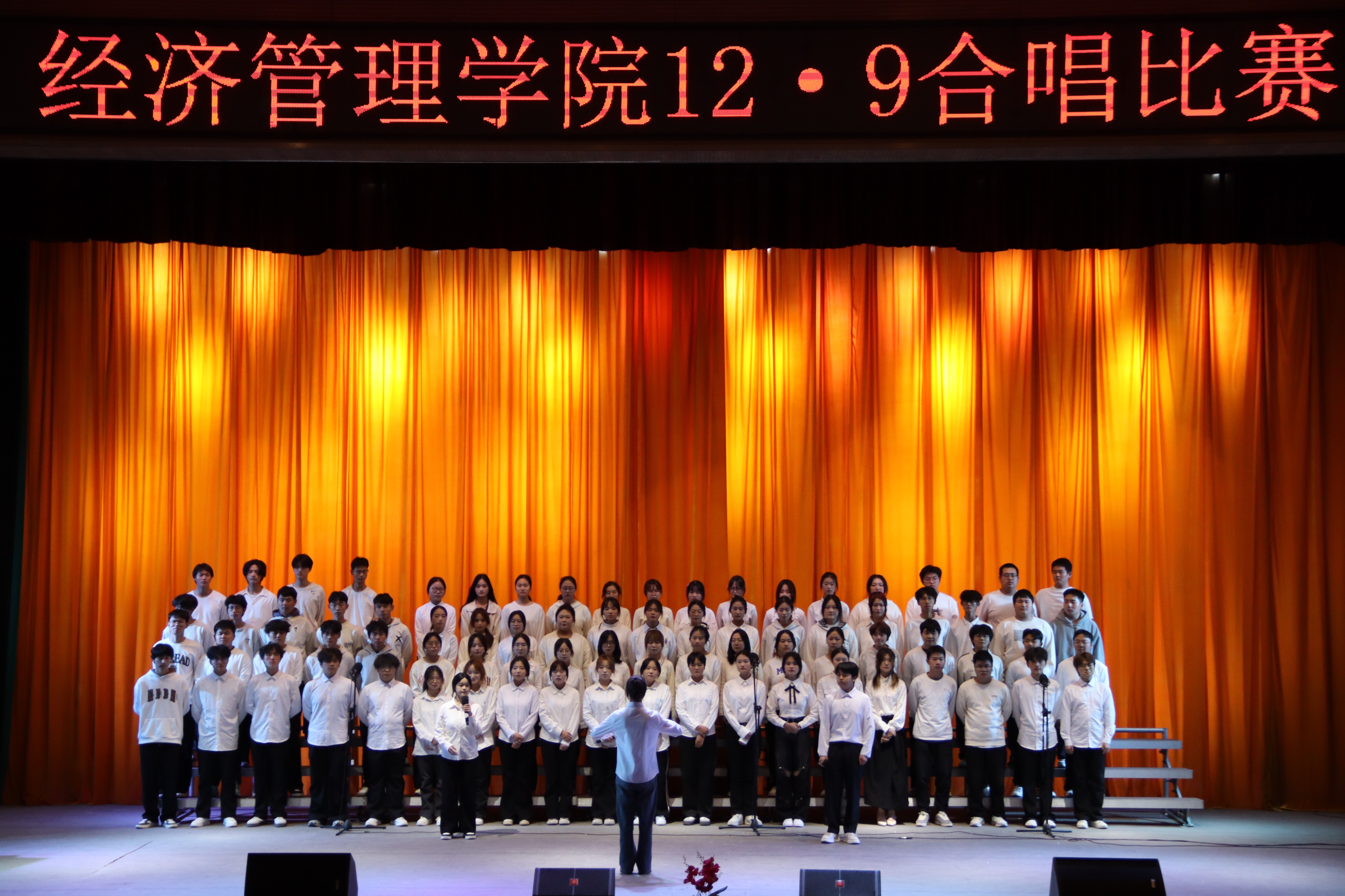 为纪念“一二·九”学生爱国主义运动九十周年,传承红色基因,凝聚青春力量,11月18日晚,经济管理学院在大礼堂隆重举行纪念“一二·九”运动合唱比赛,2024级、2025级各班级单独或组队参加。校团委郝曦,经济管理学院教学科熊杨、田敏以及全体辅导员参加评分工作。