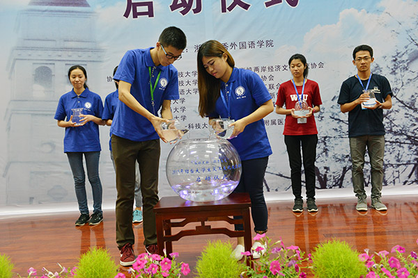 绍兴市人民政府副秘书长马民上台为两岸大学生义工代表授旗;绍台两地的大学生还分别带来了家乡的水和土,两岸学生代表在台上将水土互相融合,寓意着两岸同源同根,一脉相承。
