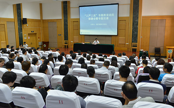 詹文都首先阐述了“三严三实”的丰富内涵和重要意义。他指出,深入开展“三严三实”专题教育,是学习贯彻习近平总书记重要讲话精神,落实全面从严治党要求的重要举措,是巩固和拓展党的群众路线教育实践活成果,深入推进作风建设新常态的重要途径,也是建设“百年越秀”和“打造中国民办大学卓越品牌”的重要保障。“三严三实”的主要内容,就是严以修身、严以用权、严以律己,谋事要实、创业要实、做人要实,它阐明了党员干部的修身之本、为政之道、成事之要,丰富了管党治党的思想理念,是新形势下加强党的建设的重要举措,也新时期加强党员干部作风建设的行动指南,对加强党员干部的党性修养,增强干事创业的主动性和精气神,顺利实现学校的办学目标具有重要而深远的意义。