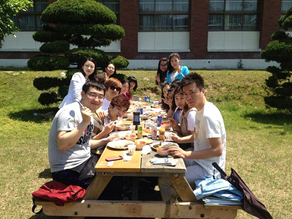 我们在练习口语的同时,了解当地的时事、政治、经济、文化等信息,掌握多方面的词汇。而且我们和当地韩国学生住在同一寝室楼,彼此聊天、沟通非常方便。来韩国以后,我们参加了很多活动,例如各国交换生的南怡岛秋游,来自世界各地的100多名国际学生和自己的韩国语伴朋友一起进行秋游、野餐、分组组织游戏;校庆典礼上,国际学生进行了美食比拼,我们中国小组做了西红柿炒蛋进行出售,其他国家的小组在比赛中也都展示了本国美食文化特色。