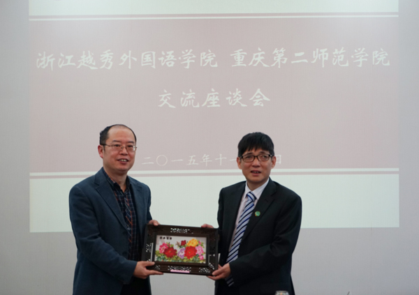 图为詹文都执行校长(右)与重庆第二师范学院杜惠平校长交换纪念礼物