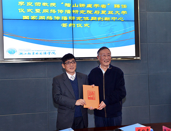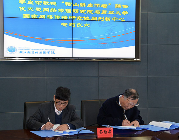 副校长朱文斌,纪委书记、网络传播学院院长朱小农,学校人事处、科研处、党委宣传部、东方语言学院、西方语言学院、网络传播学院相关负责人和教师参加签约仪式。朱小农主持签约仪式。