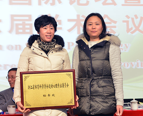 开幕式上,浙江省体育局体彩中心主任、浙江省体育科学学会理事长郭海英向足球一世官网授予“浙江省体育科学学会运动心理专业委员会秘书处”的铜牌。