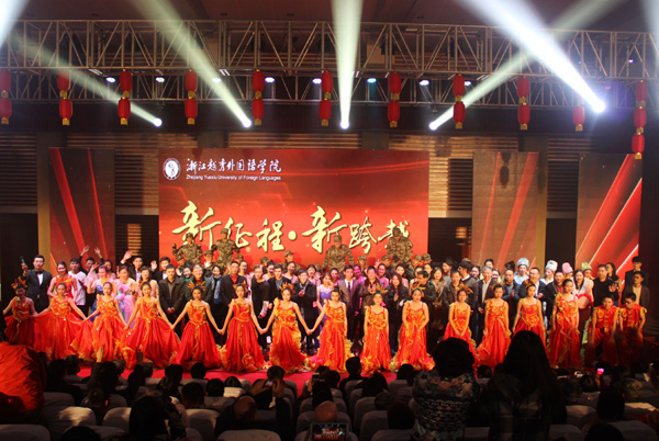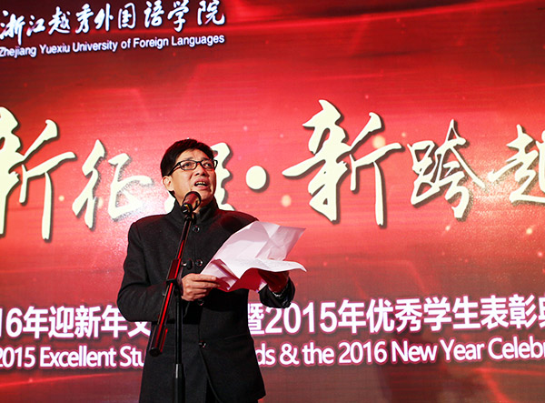 执行校长、党委常务副书记詹文都致新年贺词;绍兴市教育局副局长钱伟平,校领导何建乐、朱文斌、徐左平、单胜江、施文妹、娄华水,以及企业家代表、家长代表、校友代表,学校各处室、各学院负责人,外教代表、留学生代表和各学院师生们共同度过了美妙而难忘的“越秀之夜”。