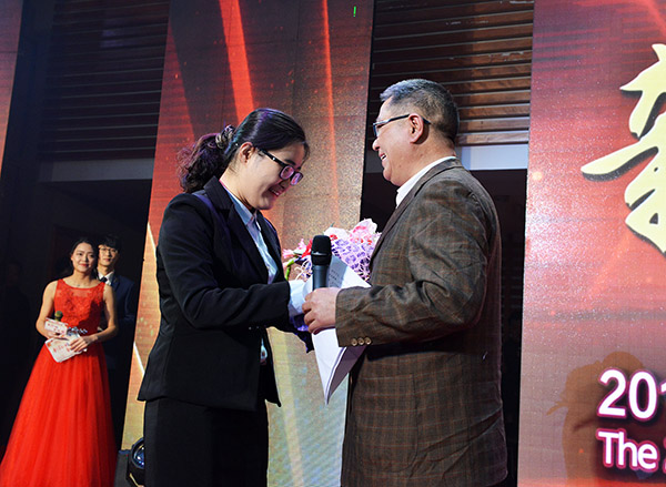 当天的晚会分为优秀学生表彰和文艺演出两个部分。首先进行的是国家奖学金、国家励志奖学金、SPT系列奖学金的表彰颁奖。詹文都执行校长与钱伟平副局长分别为获奖学生一一颁奖。奖学金获得者代表应夏婷同学和家长代表苏慧的父亲先后上台致辞。应夏婷同学更是将她所获得的5000元奖学金捐给了学校校友爱心基金,这一举动赢得观众们的热烈掌声与赞叹。
