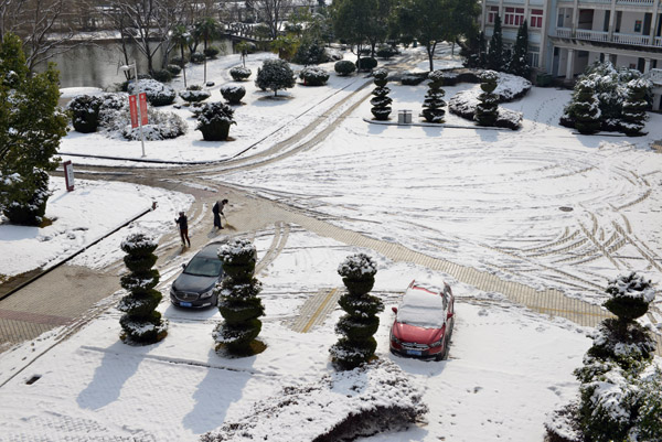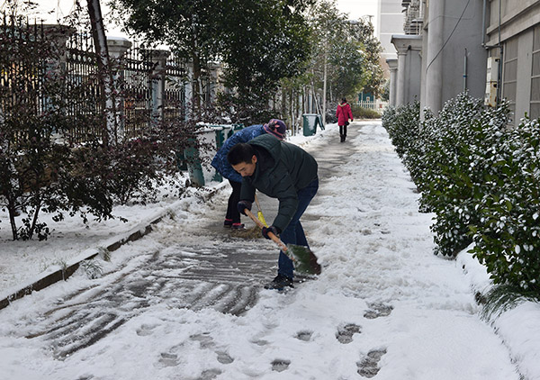 不仅后勤部门,稽山校区杜樱苑的老师和家属们也没有闲着,他们把杜樱苑过道上的积雪也打扫干净了。一位家属说:“今天晚上将降温到零下,明天更冷,路上的积雪会凝结成冰,走在上面容易摔倒,没有了积雪和水,干燥的路面就不会结冰了。不过一定要把水扫干,否则遗留的水凝结成为冰冻,路面将更滑。”