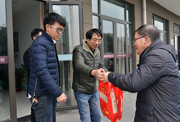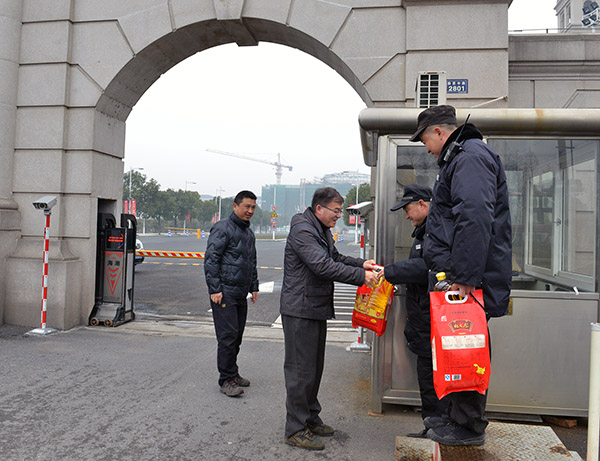 今天上午,学校副校长徐左平代表学校,对坚持在岗位工作的稽山和镜湖两个校区的120余人送去了慰问品。从学校SPT街最东边组织部开始,一路向西,科研处、后勤发展公司、财务处、外事处、成教学院、现代教育中心、基建处,一直到学校的五个大门,有120余人还在工作。仅保卫处就有近60人没有放假,保卫处副处长张晓波说,“每个校区分两班上班,每个班有10多人执勤,他们有些来自省外,也没法回家过年。不过为了学校安全,是我们应该做的。”