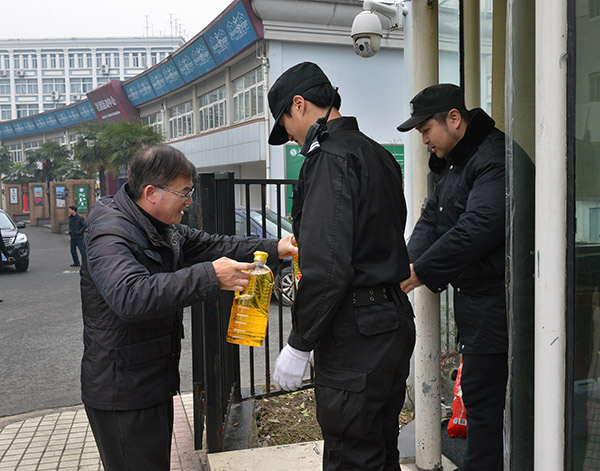 “谢谢学校领导的关心,我们会坚持工作的。”当学校副校长徐左平递给他慰问品时,来自四川的秦建激动地大声说,“我没有想到学校领导会关心我们的工作,更没有想到学校领导会关心我们的生活,我们一定坚守自己到岗位,保证学校的安全。”