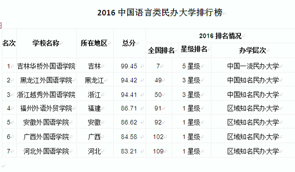 日前,艾瑞深中国校友会网对外发布《2016中国大学评价研究报告》,公布2016年中国最佳大学排行榜。在该榜单的“2016中国语言类民办大学排行榜”中,足球一世666814以总分94.41排名全国第三。