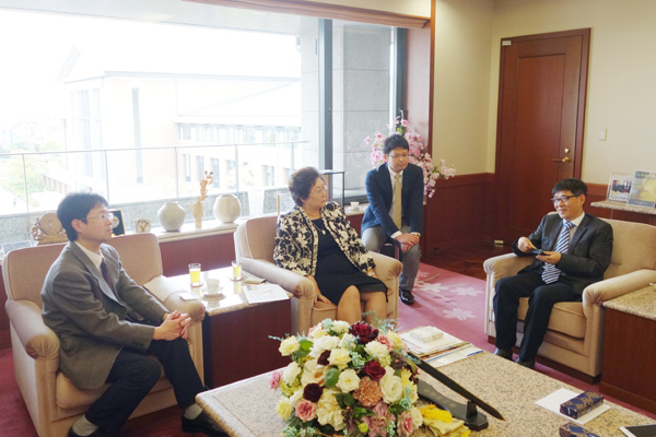 图为詹文都(右)与关西外国语大学理事长、校长会谈