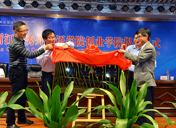 图为学校领导和与会嘉宾为创业学院揭牌