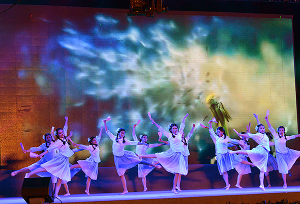 当天晚上7:00,音乐声响起,现场转入毕业晚会模式。整个田径场顿时沸腾了起来,在舞台光影特效映照下,整个晚会现场璀璨夺目,主题为“感恩母校·助梦启航”的毕业生欢送晚会在热烈的欢呼声中盛大开启,师生们用歌舞、朗诵等多种形式表达对毕业生们的深深祝福。
