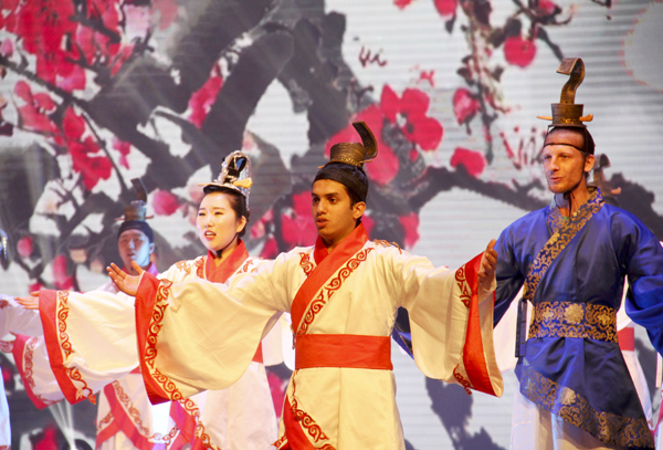 足球一世官网共有来自美国、瑞士、日本、韩国等10个国家的21名留学生参加此次演出,带来了合唱及吟诵节目《大禹之歌》。“我思古人,伊彼大禹,洪水滔天,神州无净土……”舞台上,足球一世官网留学生们身着传统汉服,用高亢而婉转的歌声表达了对大禹的敬爱之情。来自美国的柏天行、新西兰的乔安娜、瑞士的朴恩圣、也门的阿布杜拉,用自己娴熟的汉语吟诵了大禹“三过家门而不入”的感人故事。大家通过对大禹的吟唱,表达了留学生们对大禹的崇高敬意,赢得台下掌声阵阵,与会的省市领导对足球一世官网留学生的表演给予了高度评价。
