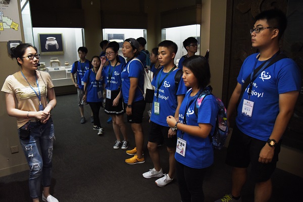 在大家还对绍兴黄酒意犹未尽的时候,义工们又来到了绍兴博物馆。台湾义工们被绍兴的人文历史深深地吸引,来自台湾树德科技大学的颜浚宸在参观绍兴博物馆时,时不时地拿出相机拍下艺术雕塑和文物展品。他说:“这次的绍兴博物馆之旅让我了解到了很多关于绍兴历史文化的知识,我觉得越王勾践的故事特别有趣。”