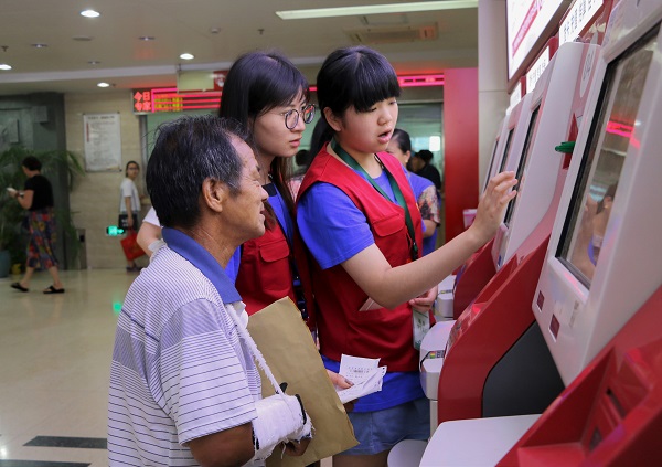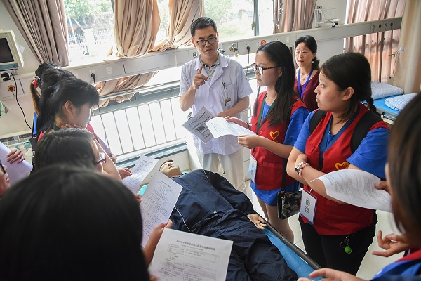 何岱恩和徐博在前两天服务的义工岗位是大厅正中的“门诊服务中心”,何岱恩觉得这三天的义工服务还是比较有意义的。第一天下午的急救心肺复苏培训给何岱恩留下了深刻的印象,她在高中的时候就接受过类似的急救培训,但没这么专业,她说:“像这样专业的培训还是第一次学,真的很有用,医生教得也很仔细。大家在医院做义工都很热情。”