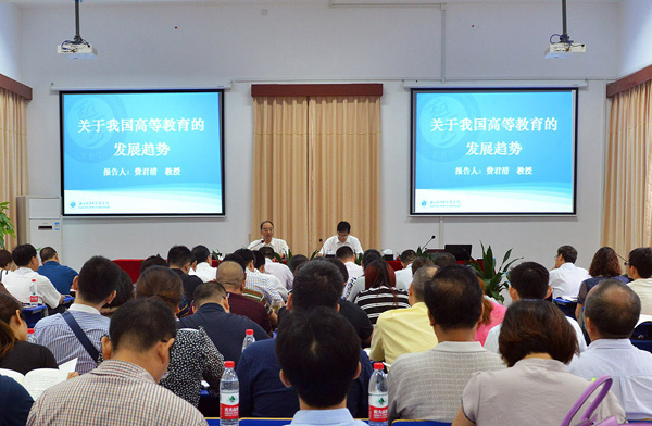 9月7日上午,校长徐真华主持开幕式,费君清教授作了《关于当前高等教育发展趋势》的主题报告。围绕主题,费君清教授深刻阐述了三个主要问题。报告首先回顾了我国高等教育从精英教育到大众化教育的发展历程。他指出,我国高等教育在近一二十年中发生了巨大变化,从过去的精英教育跨入了大众化教育阶段,正向普及化方向迈进。其次是“有学上”和“上好学”的矛盾。他表示,随着高等教育进入大众化阶段,高等教育从“卖方市场”转变成了“买方市场”,学生上大学有了更多的选择权,“上好学”的矛盾随之愈加突显。