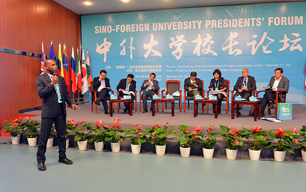 10月29日,“互联网+”时代高等教育国际化发展暨中外大学校长论坛圆满落下帷幕。论坛围绕“互联网+”时代高等教育国际化新特点、发展路径与模式、发展对比研究、人才培养创新研究等多项议题展开积极研讨。来自25所大学的校长和专家进行发言与讨论,分享了他们对“互联网+”时代高等教育国际化的理解,以及各自学校在抓住国际化机遇、明确特色化办学定位、加深学校国际化程度、实现学校快速发展等方面的实践经验。