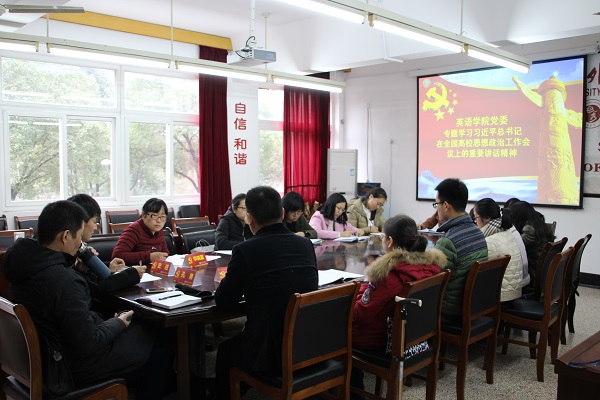 12月14日下午,英语学院组织“习近平总书记全国高校思想政治工作会议重要讲话精神”专题学习会,学习落实会议精神,部署学院思想政治工作。