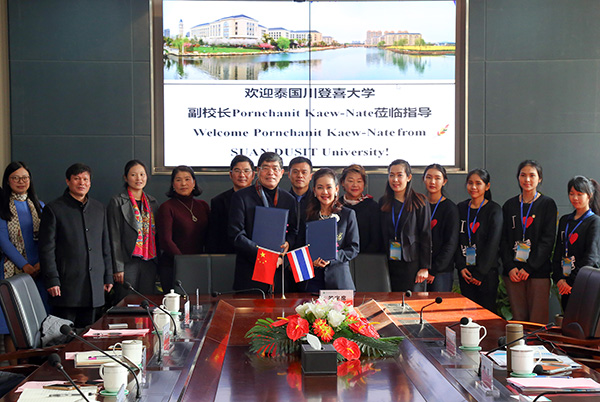 12月16日,泰国川登喜大学副校长Pornchanit Kaew-Nate一行抵达足球一世官网,展开为期1个月的文化交流活动。12月19日上午,学校校长徐真华会见代表团师生,双方就进一步加强校际合作事宜进行了深入务实的会谈。
