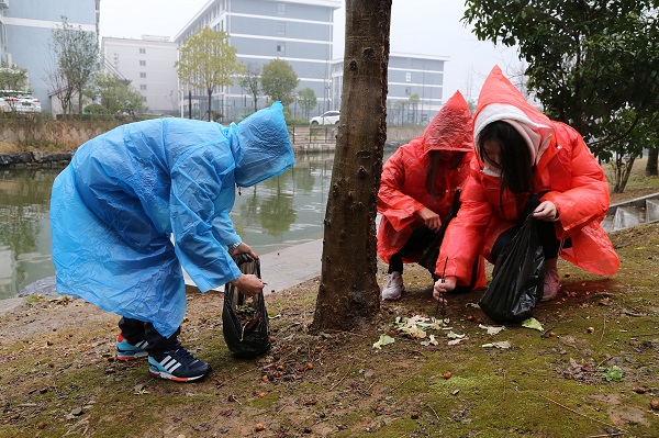 当天早上九点,参加活动的师生于越秀稽山校区西大门集合。在学校党委宣传部和团委老师的带领下,同学们身穿雨衣冒着朦胧细雨向着目的地——禹陵江出发。天空飘着雨,地上都是湿漉漉的。每个人穿好雨衣撑着伞向着目的地前行。