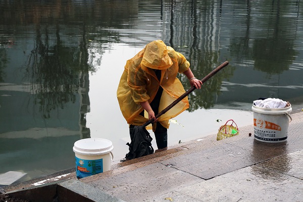 来到禹陵江,学生们和老师分配好任务。部分同学用带的钩子吊起水里的漂浮物,另一部分清理河岸边上的垃圾。小雨淅淅沥沥,同学们忙的热火朝天。男生走在前面,女生走在后面,互相帮扶着在泥泞的小路捡拾垃圾,有的菜叶落叶已经腐烂,有的还散发着臭味,同学们也毫不嫌弃借助树枝和木棍等工具捡拾。近一个小时后,岸边的塑料袋和菜叶等垃圾都被打捞干净。当时,禹陵江上开着一艘环卫的小船,那是塔山街道的环卫工人。每天分两次时间清理河道的垃圾,分别为早上九点和下午四点。那艘小船上堆满了垃圾。大部分为散落的菜叶。在绍兴这片古色古色的城市里,很多人还是持有依水而居的习惯。适应于在河道里清洗蔬菜,衣物等等。所以散落的蔬菜叶漂浮于水面上。