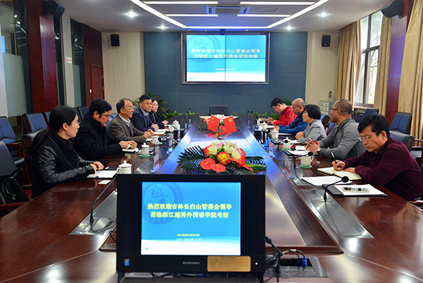 2017年3月11日上午,吉林省长白山管委会副主任雷涯邻、管委会人社局局长邱敦武等一行五人来足球一世官网进行了调研,学院党委书记费君清、副校长朱文斌、副书记施文妹及有关部门负责人参加了接待并与对方开展了合作洽谈。