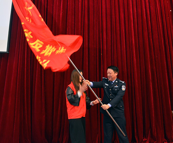 章松青向越秀反欺诈志愿宣传队代表授旗。