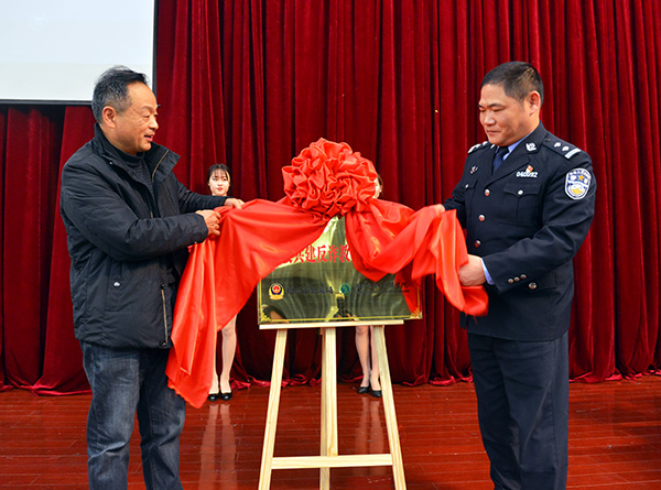傅纪明与傅志新为警校共建反诈教育实践基地揭牌。