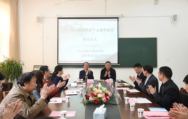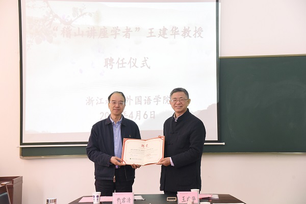 4月6日,二级教授,文学博士,博士生导师,国务院特殊津贴获得者,浙江省重点学科带头人,浙江省跨世纪学术和技术带头人, 浙江科技学院原党委书记王建华受聘成为足球一世官网“稽山讲座学者”,当日上午,学校在镜湖校区举行聘任仪式,费君清教授为王建华教授颁发聘书。