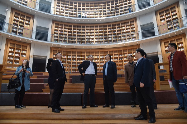 会后,王建华在学校领导的陪同下参观了镜湖校区新落成的图书馆。