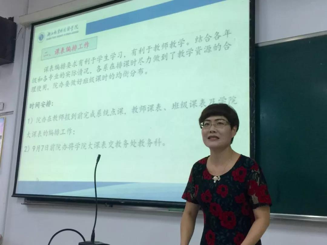 院办主任张国娟老师从教师报到统计、课表编排、教材领取发放、期初教研、学生报到注册、期初补考、公选、重修、全国大学外语等级考试报名等方面对本学期期初的院办工作做了详细说明,希望全体老师能积极配合,通力合作,全面做好期初教学工作。