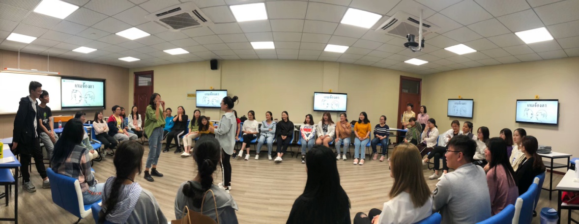 紧接着是两届新老生的相互介绍与问候。由于18级新生们的泰语有限便只能进行简单的自我介绍,相反地,老生们则借此机会展现了他们的泰语学习成果。这增进了新生们对泰语的热情也激起了熊熊的竞争之心。随后由大二的学姐学长们精心设计了许多泰语基础词汇和句子的问答,仅仅两个星期的学习,个别新生同学便已经开始显露出泰语方面的天赋,这让学姐学长们都感到很惊讶。到了游戏互动时间,同学们一起完成了智力游戏与眼色游戏。游戏仅仅围绕同学们学过的泰语基础知识,两届学生都积极参与到其中,互动中既让同学们学习到专业知识,又能乐在其中,增进交流。