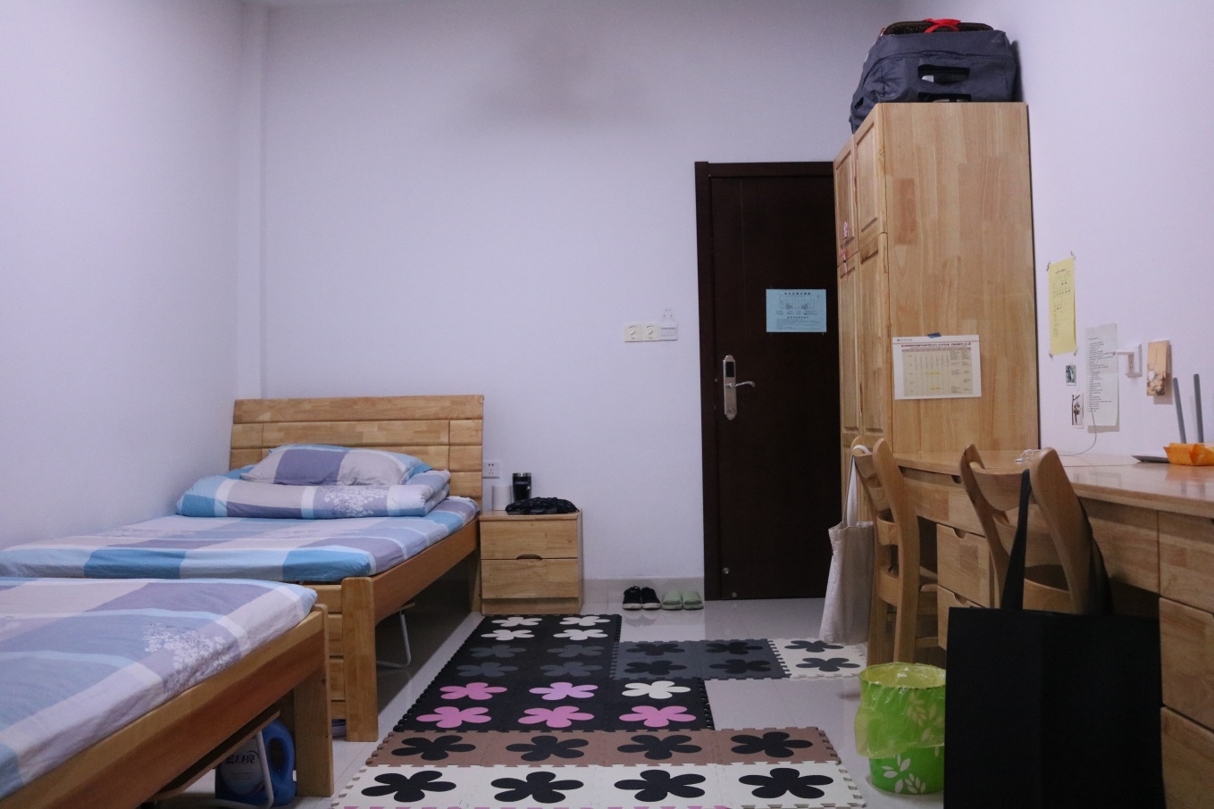 教室评分结束以后,评委团队又来到了留学生公寓进行评分。留学生们把宿舍布置得颇为温馨,床褥被子干净整齐、书桌和衣柜上的物品也摆放得竟然有序。除此以外,留学生们用巧手打扮起了自己在中国的家,只见红色的枫树在墙上不断地扩展蔓延,给人视觉上的冲击,几只生动的鸟儿在树叶间穿梭,又使墙不在枯燥,使整个寝室生动活泼;地上铺的泡沫地板垫,使宿舍看起来干净和温馨,留学生们经常在这个温馨的场地上一起学习汉语,一起聊天儿。有的留学生为了提醒自己要努力学习,珍惜时间,于是在墙上挂上了艺术钟表;有的留学生非常热爱拍照,便布置起了照片墙;有的学生非常热爱中国,就把中国国旗和自己国家的国旗放在醒目的位置。