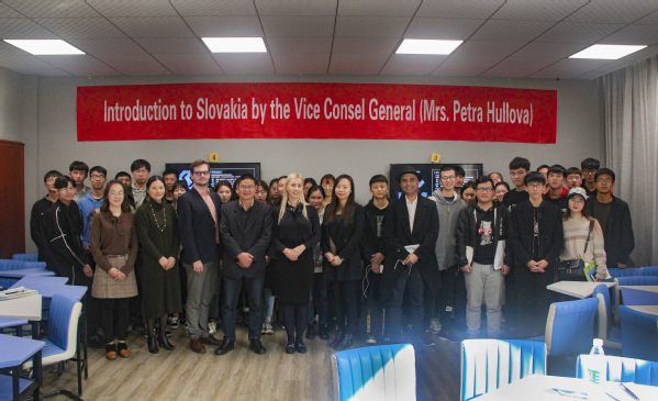 首先,Amit Sharma博士代表学院致辞,对与会嘉宾的到来表示欢迎,双方互赠礼物以示友好。接着斯洛伐克驻上海领事馆的副总领事Petra Hullova女士作了简单的自我介绍并向到场的师生致以友好的问候和诚挚的感谢。接下来领馆人员钟璇向师生们展示了斯洛伐克的历史文化、教育风俗、风景名胜、特色商品等。她提到,斯洛伐克有着深厚的历史底蕴,他们的木结构教堂、伏佳拉乐器、温泉以及岩洞等多项物质文化被列入联合国教科文组织世界遗产名录。斯洛伐克是世界上城堡最多的国家,如著名的波耶尼切城堡,具有独特的哥特与文艺复兴艺术风格。作为舌尖上的国家,他们有独特的烤鹅宴、受欧盟保护的烟囱卷和诸多的葡萄酒庄园。更主要的是有高水平的大学和教育科研机构,还有高水平汽车制造工业。