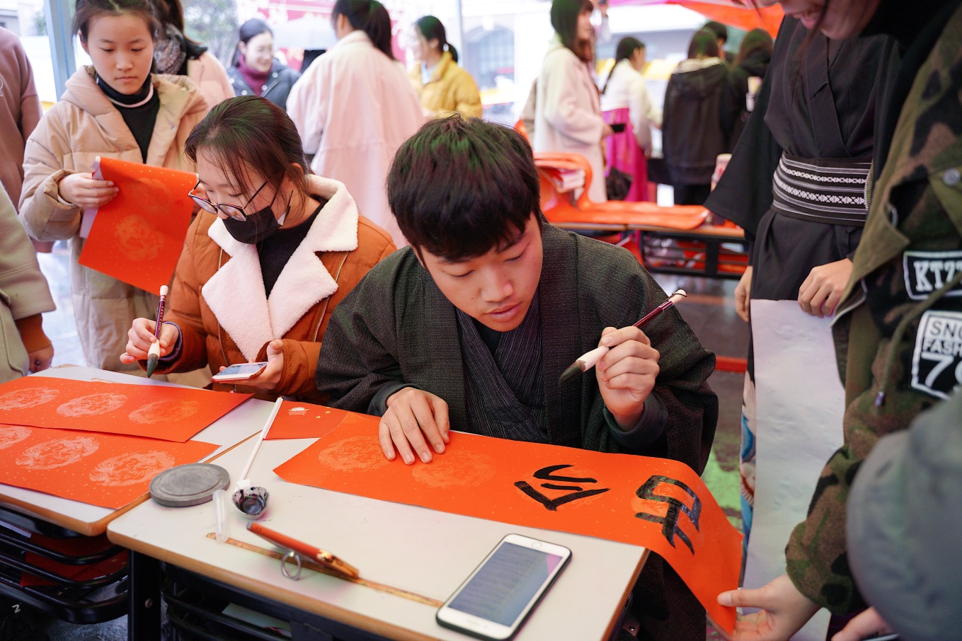 日本馆的留学生则为大家准备了小游戏——抽签,抽到扇子的学生可以收获到用日语写下的祝福语。对日本文化感兴趣的同学自然不会错过这个难得的机会,纷纷踊跃参加,希望在扇子上写上满满的祝福。