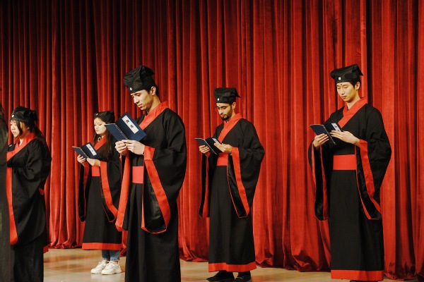 留学生的入学礼则将本次开学典礼推向了高潮。留学生们穿上传统汉服,历经正衣冠,行礼,点朱砂,诵读等环节。行礼代表着留学生们今后听从老师的教诲,点朱砂则代表着老师们鼓励学生在今后开启智慧,勤勤恳恳地学习。这次入学礼不仅让留学生们认识了中国古代的入学礼,也寄寓了学院对留学生的殷切希望。