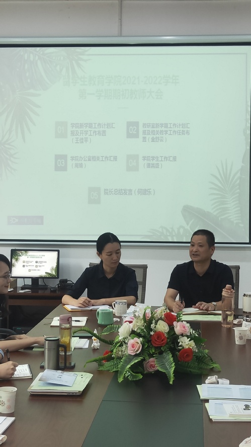 会议第三项由办公室通报新报名留学生情况、班主任安排等日常管理情况,同时介绍本学期学校重大活动和学院主要特色活动,希望老师们能群策群力,共同推动相关活动的顺利开展。