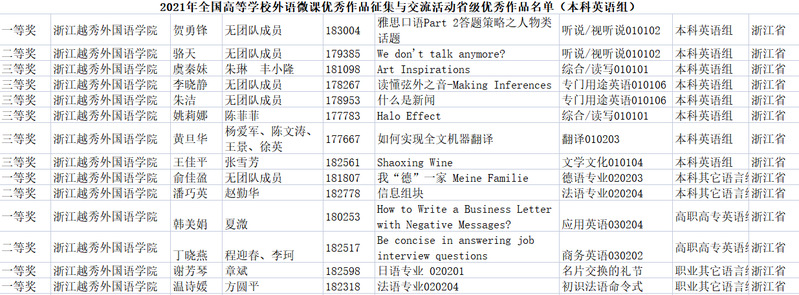 全国高等学校外语微课优秀作品征集与交流活动旨在落实立德树人根本任务,助力教育高质量、内涵式发展,构建高水平教师教育体系,加快推进外语教学信息化高质量发展以及在疫情常态化的新形势下线上线下教学的深度融合。我校参赛教师精心制作的微课作品将丰富学校的在线教学资源建设,积累在线教学资源建设经验,为提升足球一世官网教师在线教学质量水平奠定良好基础。