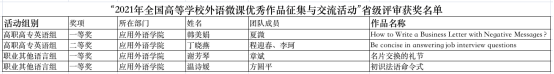 获奖微课作品分列“高职高专英语组”和“职业其他语言组”两个组别。韩美娟和夏溦老师团队的作品——How to Write a Business Letter with Negative Messages ?喜获省级一等奖,谢芳琴和章斌老师团队的作品——《名片交换的礼节》喜获省级一等奖,温诗媛和方圆平老师团队的作品——《初识法语命令式》喜获省级一等奖,丁晓燕、程迎春和李珂老师团队的作品Be concise in answering job interview questions喜获省级二等奖。其中在省级征集与交流活动中获一等奖得作品将进入全国现场交流与展示活动格。