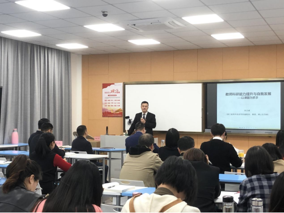 首先,朱文斌教授通过来自其他名校名师的调研数据和案例分析,突出科研对于教学育人、教师成长的重要性。他指出,研究是教师专业发展的阶梯,要凝聚项目产生研究方向,围绕项目产生研究成果。青年教师成长重在通过科学研究促进教学实践,基本把握教学规律,深化教学内容。专家型教师的目标是依托研究进行必要的专业知识更新、观念的转变。