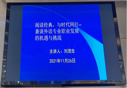刘教授主讲的内容主要分为“当代外语专业学生的职业发展以及如何应对未来的挑战”和“阅读经典文学与时代并行”两个部分。