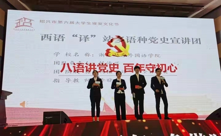 西方语言学院 西语“译”站 学生党史宣讲团在“绍兴市第六届寝室文化节”之党史学习教育宣讲先进团队评选中获得学生组二等奖。四位学生代表在现场用俄语、西班牙语、捷克语、波兰语讲述了长津湖战役中的精彩故事,在建党百年之际用独特的方式展现了外语学习的魅力。