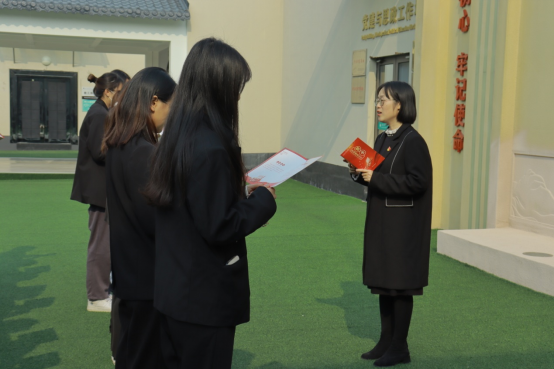 宣誓后,由学院党委副书记赵莹老师为每位新党员颁发《党员政治生日贺卡》,党员政治生日是党员的入党日,也是党员的第二个生日。在宣誓仪式上发放《政治生日贺卡》,旨在提升党员的责任感、使命感。贺卡上印有入党誓词以及对党员同志政治生日的祝福语,以此勉励每一位新入党的党员,不忘初心,牢记使命!